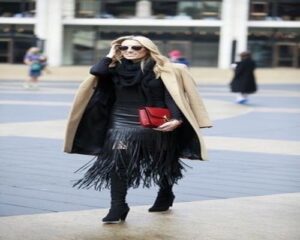 A midi skirt sits perfectly against the top of the boot shaft, creating a clean silhouette for the leg. Every step brings the fringe to life, giving the whole outfit a dynamic, expressive quality.